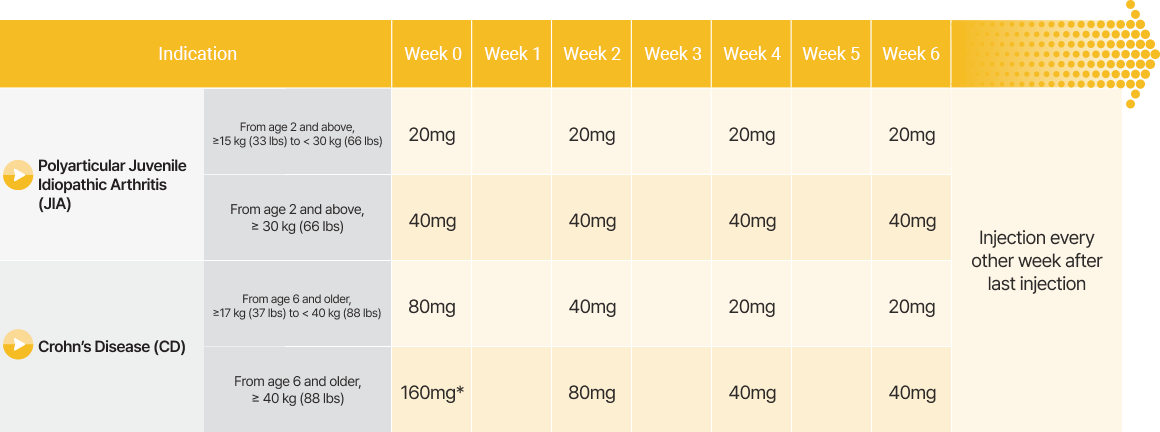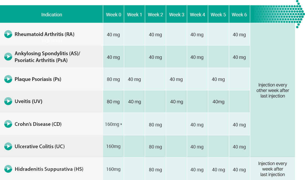 Initiation doses and follow-up schedules may differ depending on your condition. For pediatric patients, dosing depends on body weight. Speak to your doctor about your dosing and administration schedule. Note that Adalimumab-aaty is available as 80 mg, 40 mg, and 20 mg prefilled syringes (80 mg and 40 mg prefilled syringes with a safety guard) and as 80 mg and 40 mg prefilled auto-injectors.